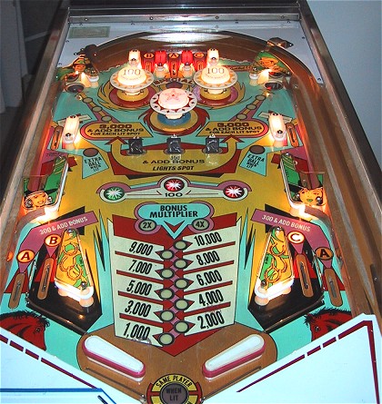 Bronco Story: Bronco was the first "EM" pinball machine I owned. I bought it at the urging of my wife who wanted a pinball machine with a horse theme and "the bells". She likes the slower play of the EMs and was bugging me to get one. This particular machine was offered for sale on the Mr. Pinball classifieds by a local seller about 15 minutes away. Needless to say we jumped at the sale and picked up the machine. It was a pretty uneventful purchase for me (every pinball purchase or sale I do seems to have a saga attached to it!) The machine worked fine from the start and was enjoyed for almost two years. I grew tired of it after about one day (it doesn't even have any slingshot kickers!), but it was enjoyed by visitors who where a bit too shy to step up to the newer machines. Typical of Gottlieb pins of the era, it has a symmetrical design (both sides of the playfield are the same) and plays very slowly. An acquaintance of ours husband owns an antique "marketplace" in town and asked me if I was interested in selling one of my machines there. He was doing up a soda shop type thing with an actual fountain counter setup, an old bubbler jukebox and some restored Vendo Coke machines. He said than an EM pinball would be a wonderful compliment. Neither of my other two EMs (Gottlieb's Masquerade, 1965 and Bally's Captain Fantastic) are in any shape to sell, so I volunteered to bring over the Bronco since it wasn't something I needed to hang onto. I did a quick shop/restoration job on the machine and it was ready to go! He bought the machine in January of 2002 and it sold in March. |